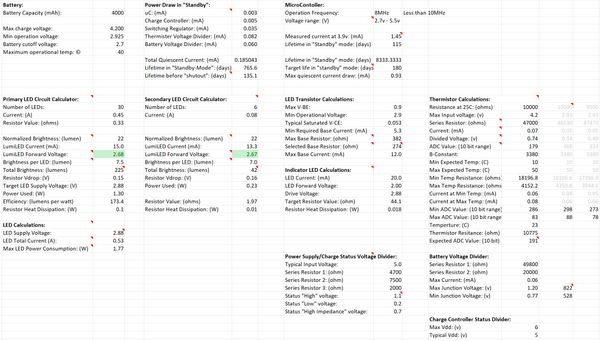 Using Excel, we modeled the electronics system to help ensure that we could hit our target product specifications such as the battery life, power efficiency and lumen output. This model allowed us to determine values for the system components and make predictions about the system behavior.