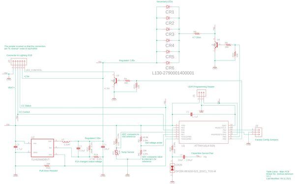 Once we had functioning PCBs, we integrated firmware to give the lamp behavior and functionality. A low-cost, low-power microcontroller was utilized to monitor the capacitive touch user inputs, PCB temperature, battery voltage and charging status. Using firmware, we also explored different user interaction options for how the lamp changes brightness and displays information to the user about the battery level and charging status.